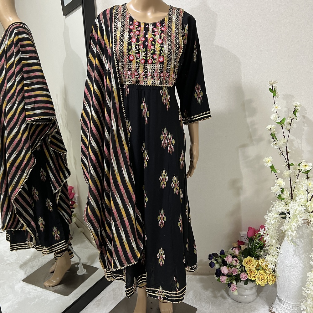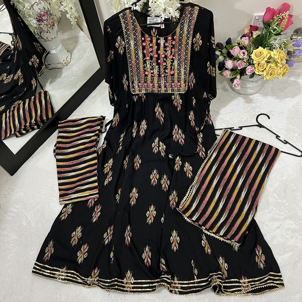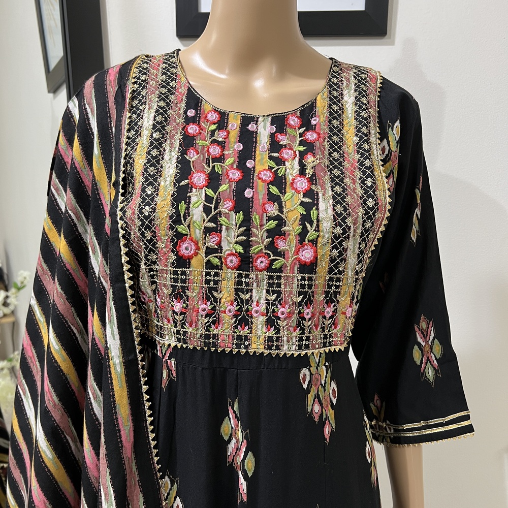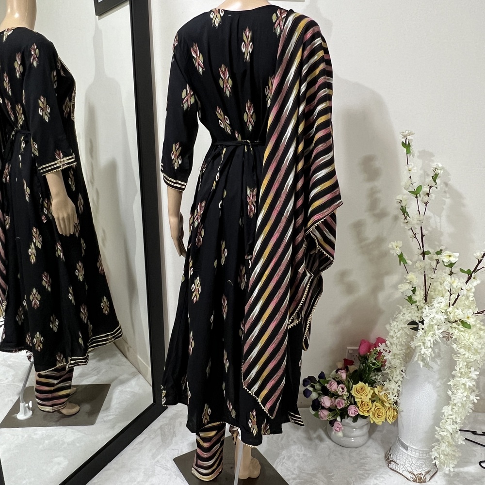 Spread your magic with this beautiful black flared frock suit made of printed cotton fabric. The black frock-style kurta is adorned with intricate prints, adding an alluring charm to the ensemble. The intricate patterns blend seamlessly with the rich black hue, creating a mesmerizing visual appeal. The frock-style silhouette exudes sophistication while ensuring comfort and ease of movement. Complementing the kurta are the striped palazzo pants, adding a modern twist to the traditional attire. The contrasting stripes infuse the ensemble with a dynamic energy, making it a standout choice for any occasion. To complete the look, we present a matching striped dupatta, adding a touch of elegance and finesse. The dupatta drapes gracefully over the shoulders, enhancing the overall allure of the outfit. Get ready to dazzle in this stunning outfit!