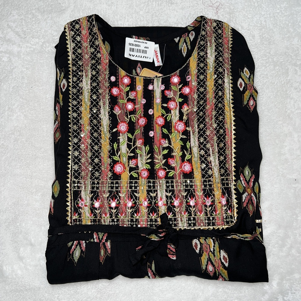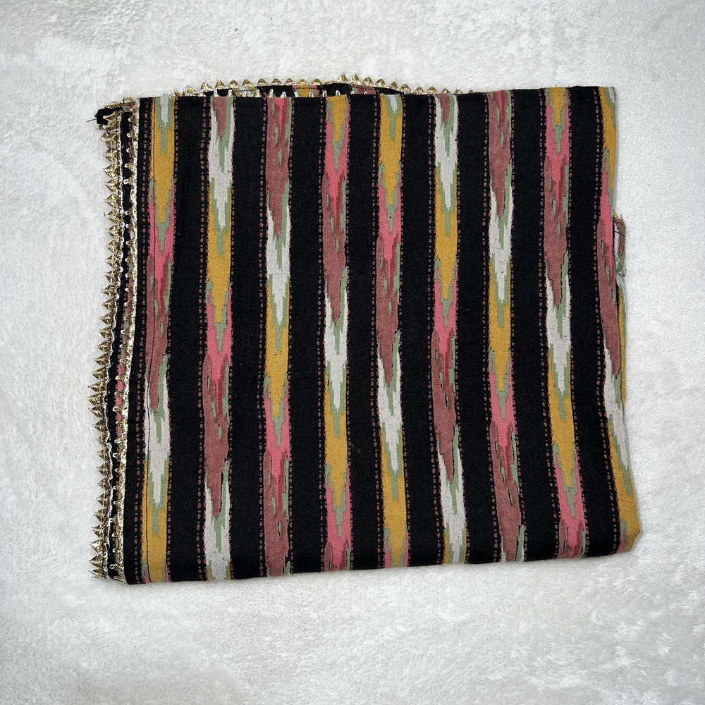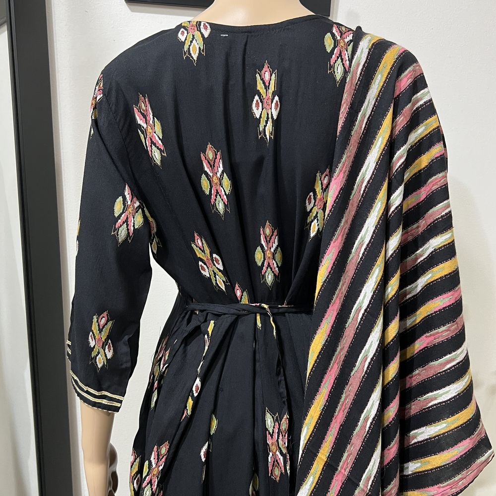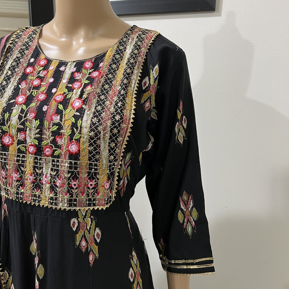 Spread your magic with this beautiful black flared frock suit made of printed cotton fabric. The black frock-style kurta is adorned with intricate prints, adding an alluring charm to the ensemble. The intricate patterns blend seamlessly with the rich black hue, creating a mesmerizing visual appeal. The frock-style silhouette exudes sophistication while ensuring comfort and ease of movement. Complementing the kurta are the striped palazzo pants, adding a modern twist to the traditional attire. The contrasting stripes infuse the ensemble with a dynamic energy, making it a standout choice for any occasion. To complete the look, we present a matching striped dupatta, adding a touch of elegance and finesse. The dupatta drapes gracefully over the shoulders, enhancing the overall allure of the outfit. Get ready to dazzle in this stunning outfit!