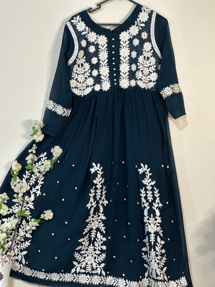 Designer Anarkali frock suit is a symbol of tradition and elegance that captures the essence of Indian culture. The beautiful and designer teal blue piece is designed with white color embroidery. So, keep refreshing your wardrobe with an Indian Wedding Anarkali Dresses.