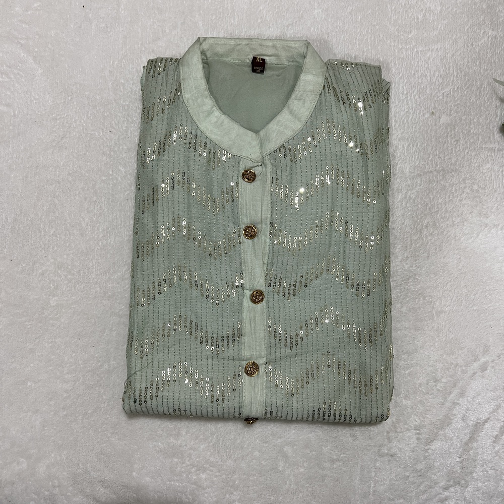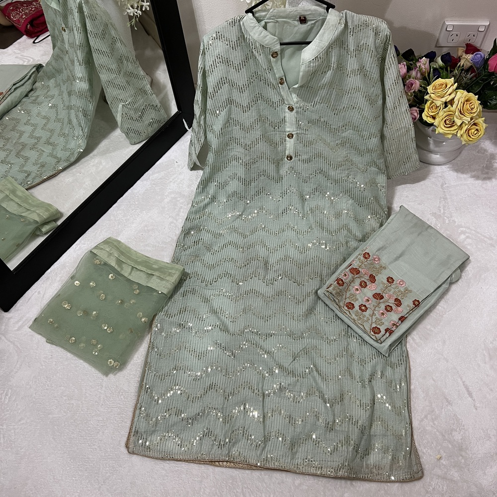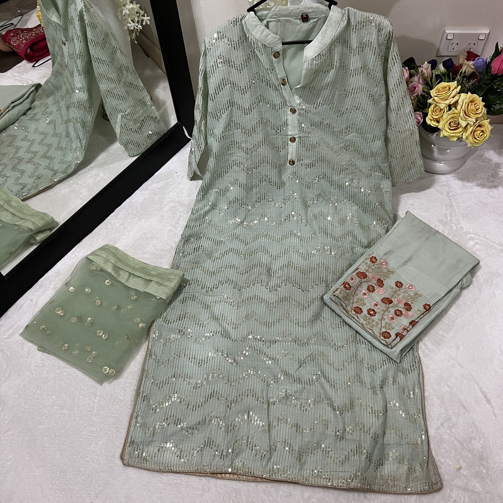 This 3piece cotton suit has intricate sequin work, a classic collar neck design, and elegant buttons. The palazzo pants have beautiful embroidery at the bottom for a stylish look. The bordered dupatta adds sophistication to the ensemble and can be draped in various styles to match your preference. It’s a versatile outfit that adds elegance to any attire.