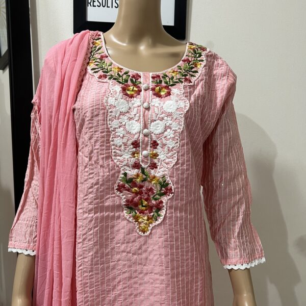 This pakistani suit is made from high-quality pure cotton, which is known for its comfort and breathability. The neckline of the kameez is richly embroidered, creating a focal point with its intricate patterns and vibrant colors. The bottom of the kameez also features similar embroidery, adding balance and sophistication to the design. The entire suit fabric is decorated with full threadwork, which enhances the texture and adds a dimensional richness to the piece.