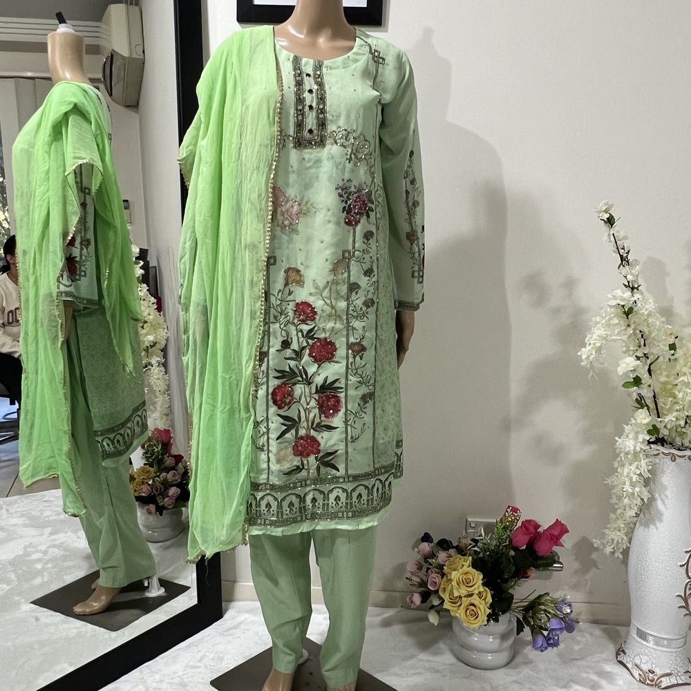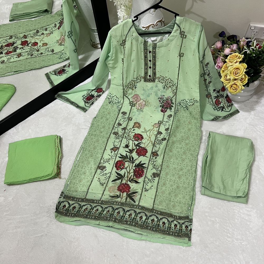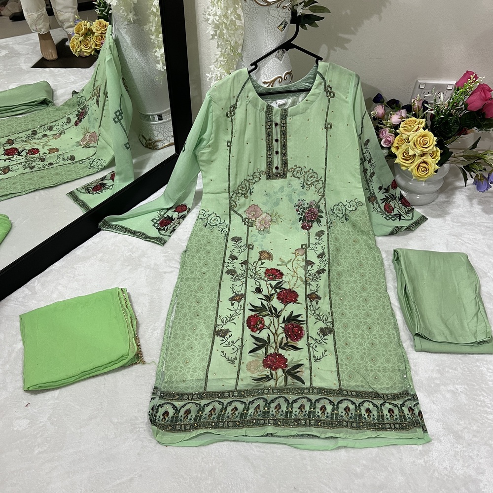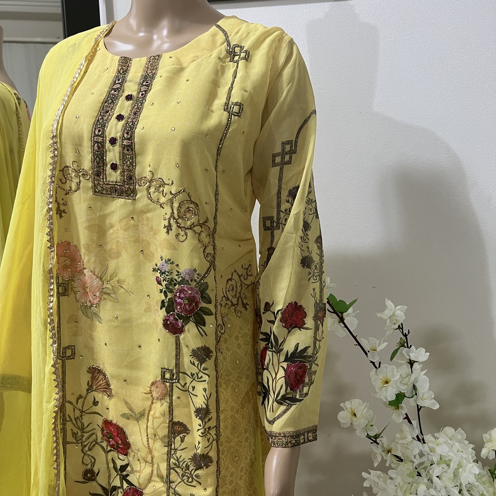 This Pakistani suits feature Nalpi and Sippy needlework embroidery on georgette fabric, which add elegance to the outfit. The palazzo pants complement the outfit, and a pure dupatta completes the sets. These comfortable and stylish ensemble are perfect for various events.