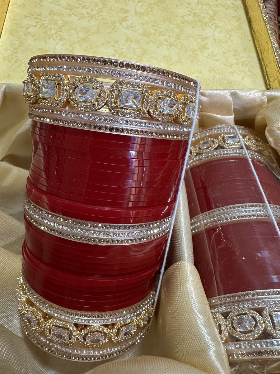 MS Collection presents the exquisite Red designer Polki chuda which is a symbol of tradition and elegance that captures the essence of Indian culture. This magnificent piece of jewellery is meticulously crafted to add a touch of grace and charm to every bride’s ensemble.