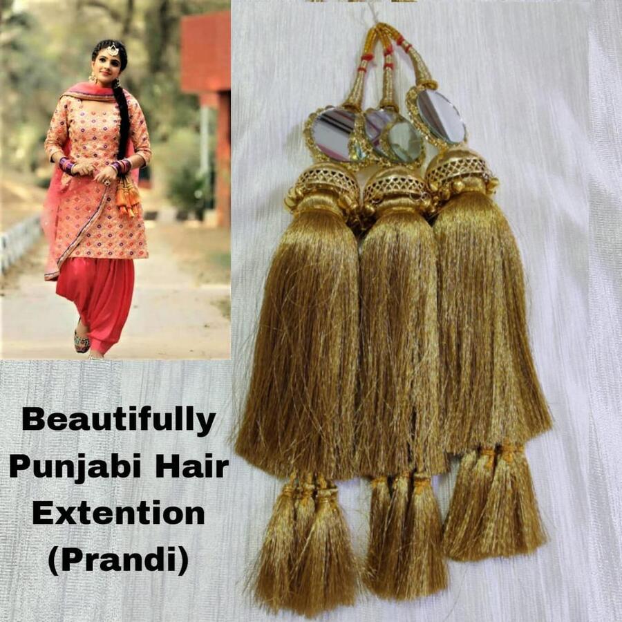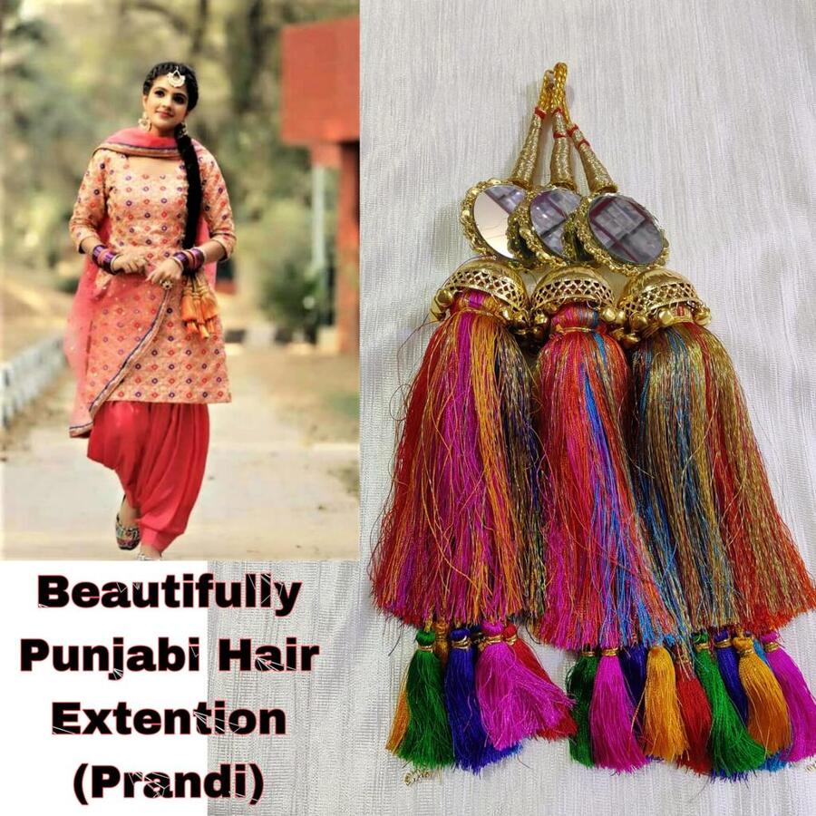 Pranda is a part of ethnic Punjabi clothing. It is a colourful hanging worn by the Punjabi women in their hair. Ms collection these hair ornaments are made out of bunches of vibrant silk thread and small tassels are up at the bottom. These pranda sets come with black Dori.