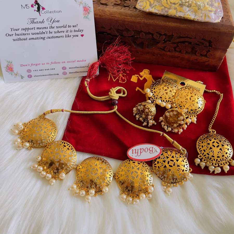Adab Punjaban Traditional Jewellery presents by Mscollection. Alloy, Gold plated golden drop beads necklace set including jhumki earrings and matching tikka.