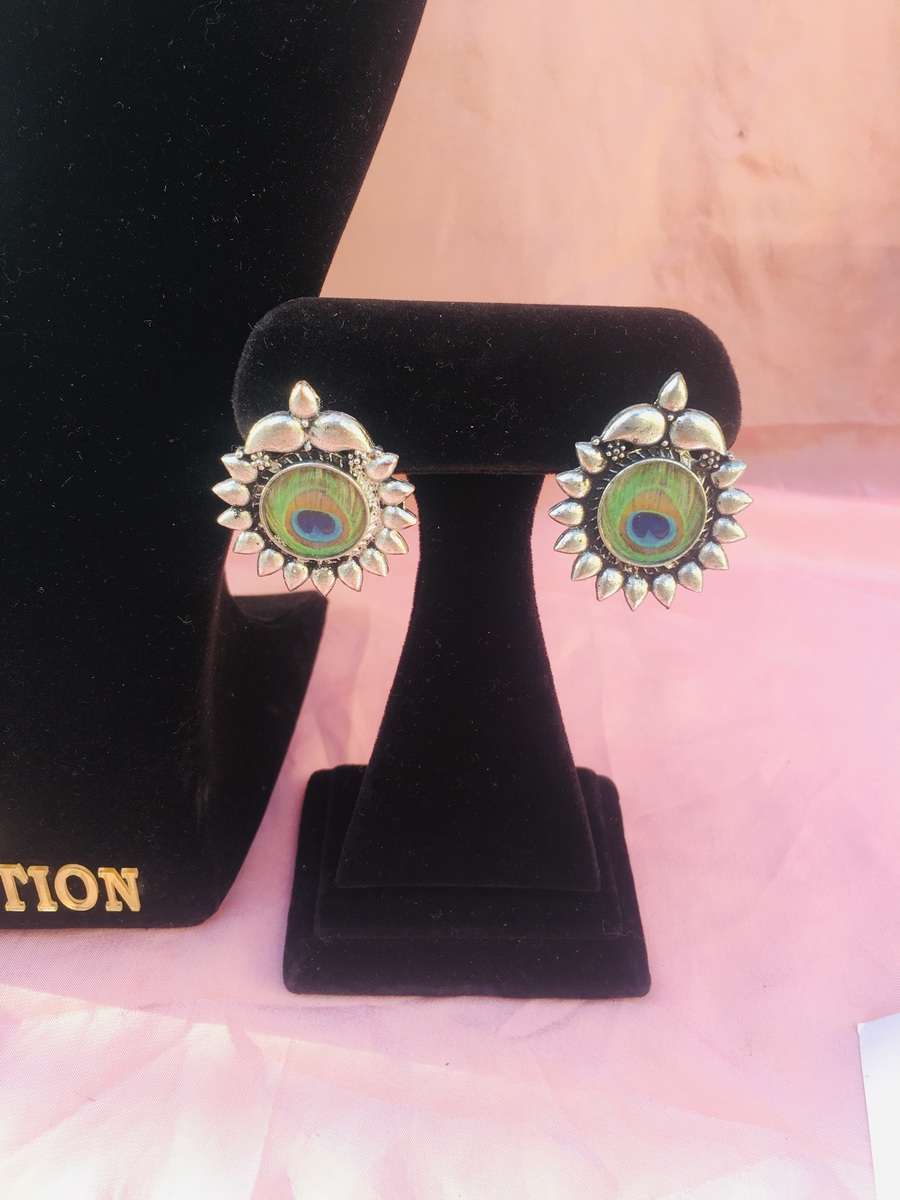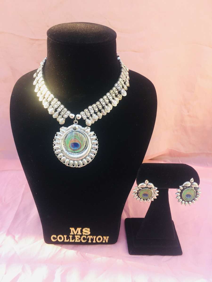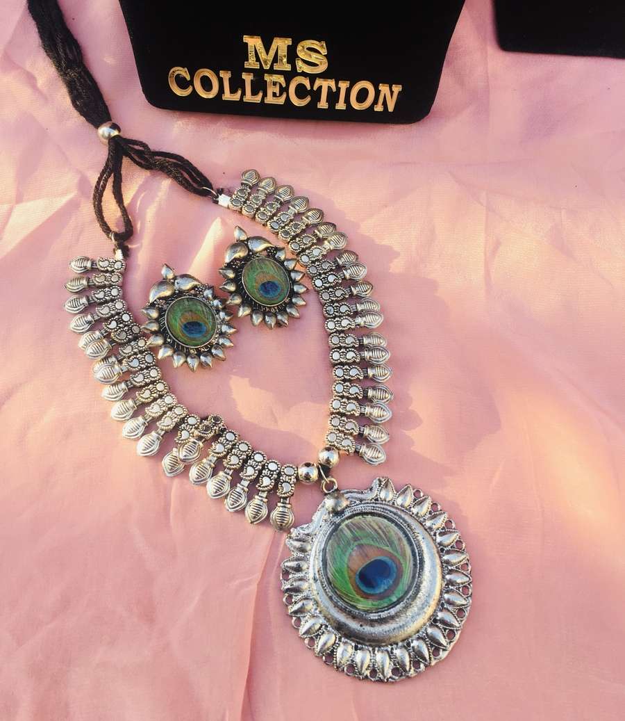 Adorable lord krishna flute designed silver oxidised necklace set including necklace and flower design studs. Look stylish and flaunt your signature style by wearing this oxidised set. It will elevate your style quotient in no time.