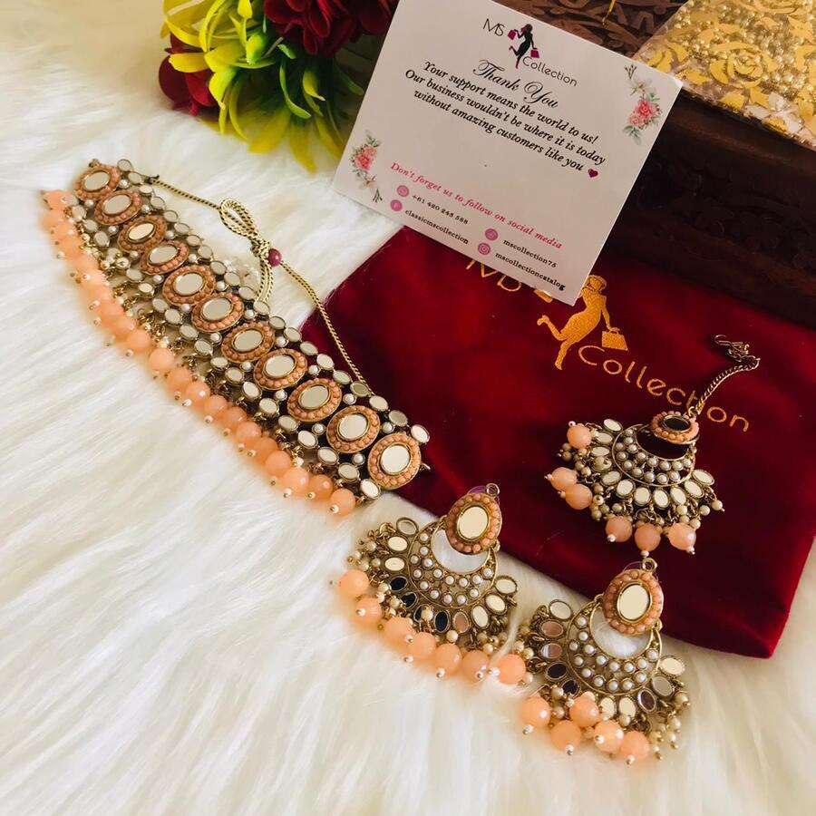MS Collection presents traditional handcrafted Alara beads with mirrorwork necklace sets for weddings and special occasions. This jewellery set comes with matching earrings and a head tikka.