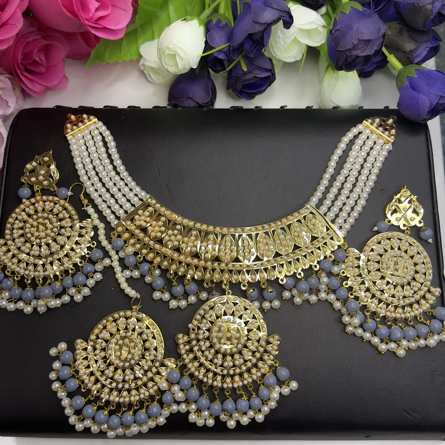 High quality this Gold plated and grey beads jewellery set consists of a necklace and jadau earrings with jadau tikkas.