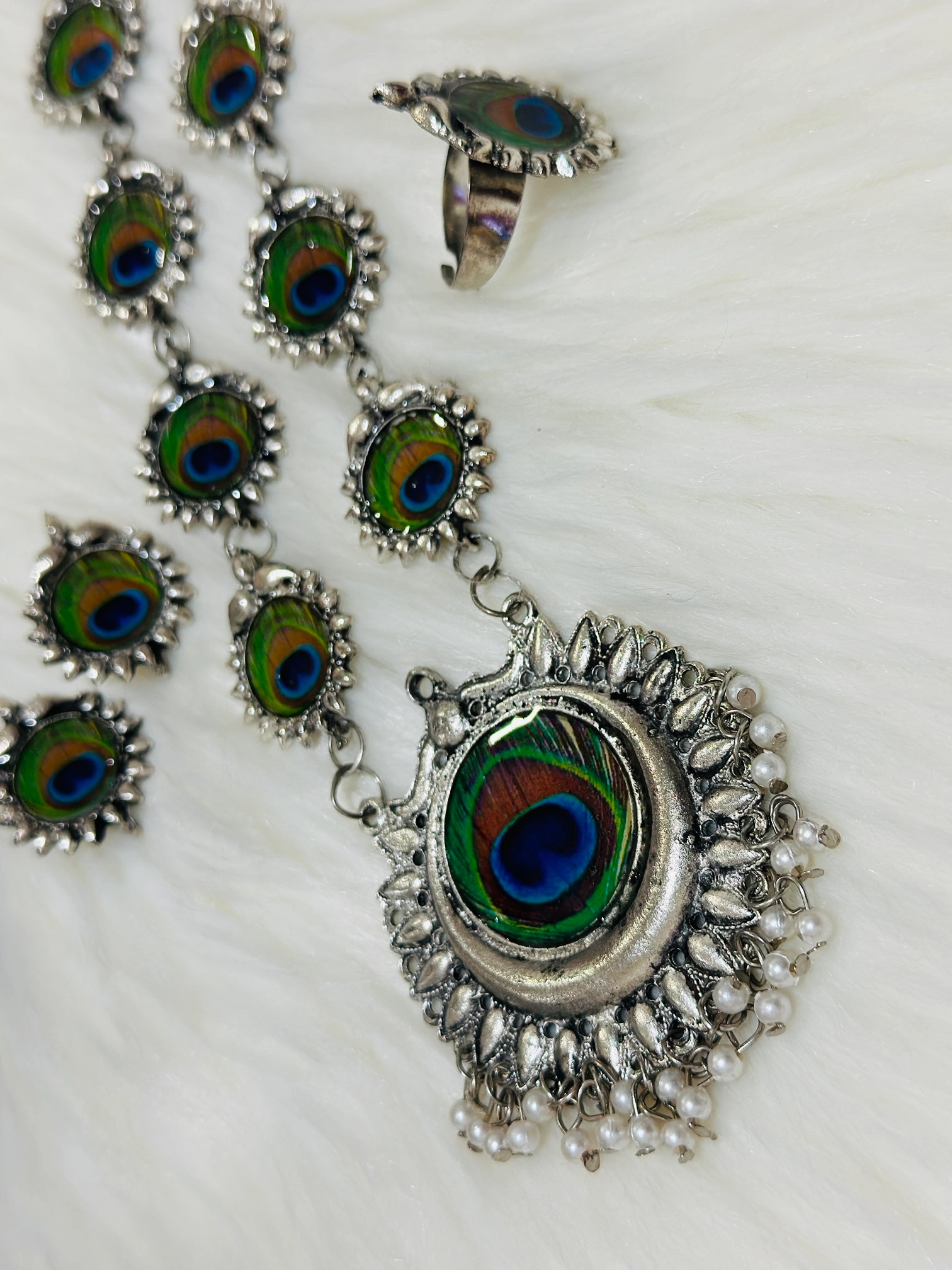 Shop MS Collection’s Lord Krishna silver oxidized temple jewellery including a long necklace with earrings and a ring. The German silver plating used when combined with this design gives a distinctive traditional look to this set.