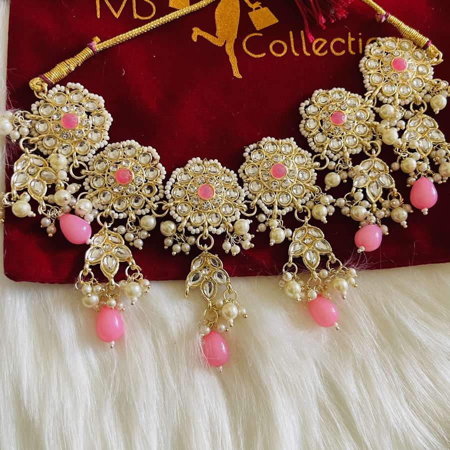 High-quality Hasrat Pachi Kundan necklace set with pink color drop beads including beautiful matching earrings.