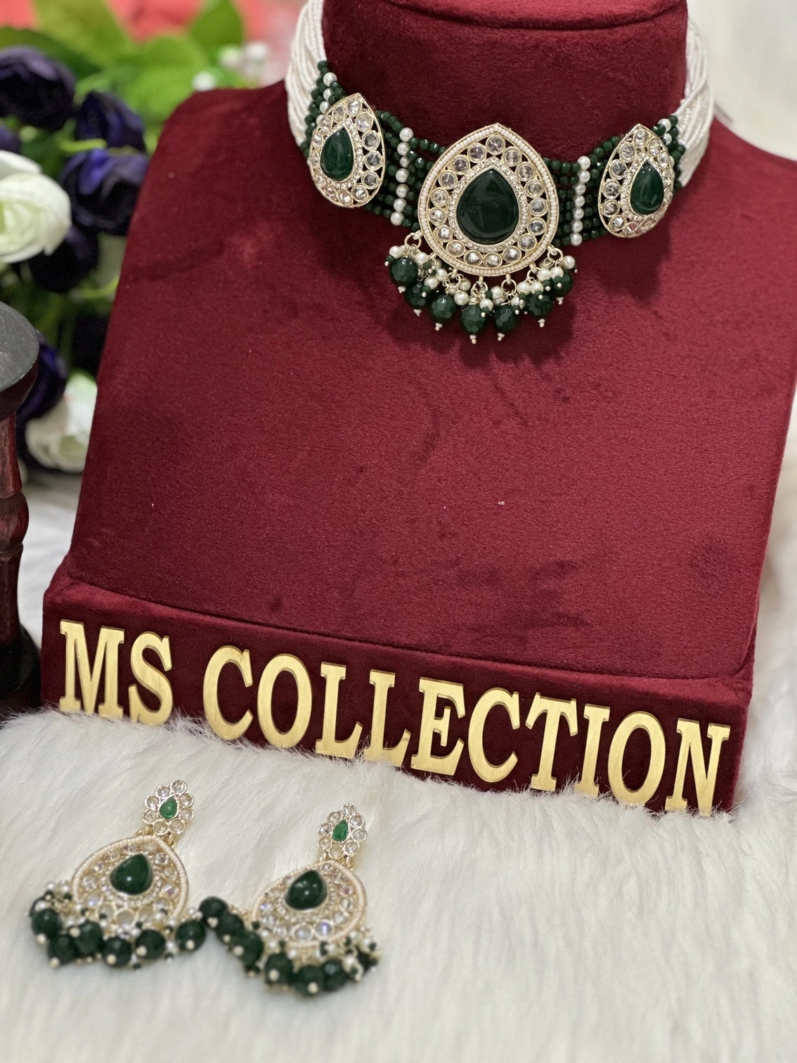 MS Collection’s dreamy and handpicked piece of Kundan jewellery, the choker necklace comes with Kundan earrings. Beautifully crafted and bedazzled jewellery with dark green Kundan beads, perfect with ethnic outfits!