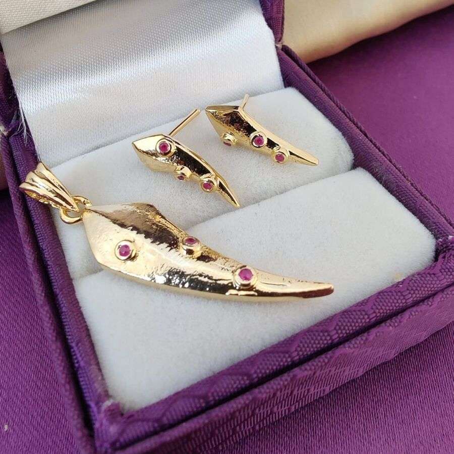 Beautiful gold plated earrings and pendant set which is designed in sword shape with big Magenta stones.